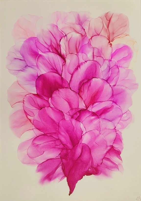 This original art piece showcases a stunning flow and fluidity achieved through airbrush techniques, resulting in delicate petals creating flowers that appear through the flow of the ink. Each petal is individually created, making a unique flower bouquet. This rare abstract floral art piece will bring a beautiful and relaxing atmosphere to any room. It’s perfect for those who have a love for flowers and appreciate the beauty and intricacy of this artwork. Don’t miss out on the opportunity to own this rare abstract floral art piece which will bring a beautiful and relaxing atmosphere to any room.