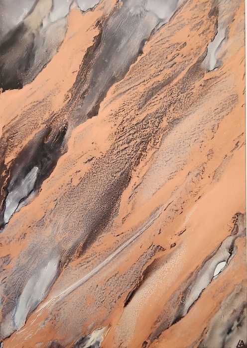 Introducing a one-of-a-kind alcohol ink art painting that is sure to captivate and exuberate warmth in any room it is displayed in. Created using different air tools, this original art piece features shades of grey and warm copper colours that flow and blend together in a beautiful abstract piece. Don't miss out on the opportunity to own this beautiful and one-of-a-kind alcohol ink art painting, that add a touch of warmth and beauty to your home or office.