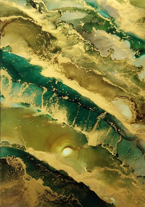 Indulge in the captivating beauty of this one-of-a-kind alcohol ink art painting. This stunning original art piece is created using a unique flow and airbrush technique that gives it a soft and fluid appearance. The painting features a gorgeous range of deep to soft greens with a delicate balance of gold flowing through to add a touch of shimmer and reflection. This beautiful and abstract panel draws you in, making it impossible to look away. It is very versatile as it can be hung in different directions to truly showcase its beauty.
