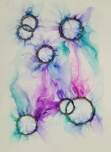 This stunning alcohol ink art piece features beautiful shades of purple and blues with gold layered circles that create a soft flow of colors that seem to flow out of the circles. The delicate attention to detail and unique design give this piece a one of a kind quality that is sure to make it a standout addition to any home or office decor. It is a beautiful work of art that embodies the perfect balance of color and design and will surely be admired by anyone who sees it.