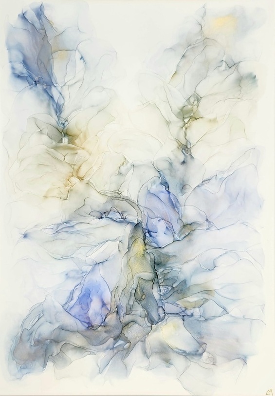 The larger size of my artwork whereby I can let the ink flow freely. Soft Dusky Blue colour with gold. Artwork measures 42 x 60 cm (A2) and comes framed in a white frame with Plexiglas measuring 62 x 86 cm (A1)