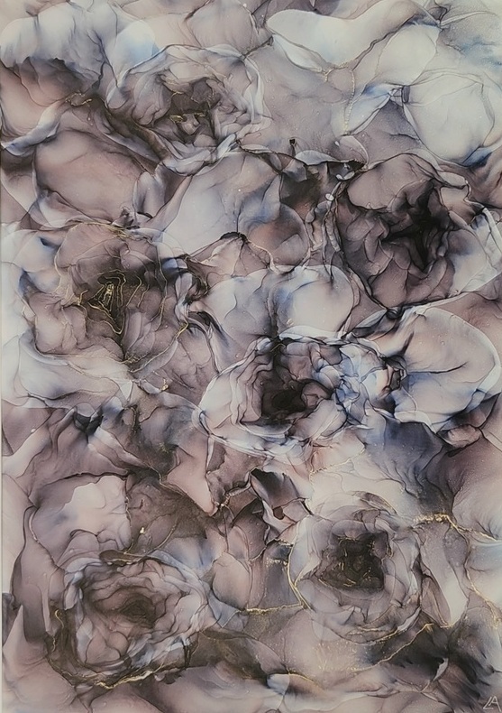 Indulge in the captivating beauty of this one-of-a-kind alcohol ink art painting. This stunning original art piece is created using a unique flow and airbrush technique that gives it a soft and fluid appearance. The painting features a black ink with a delicate balance of grey with silver accents through to add a touch of shimmer and reflection. This beautiful and abstract artwork draws you in, making it impossible to look away. It is very versatile as it can be hung in different directions to truly showcase its beauty.