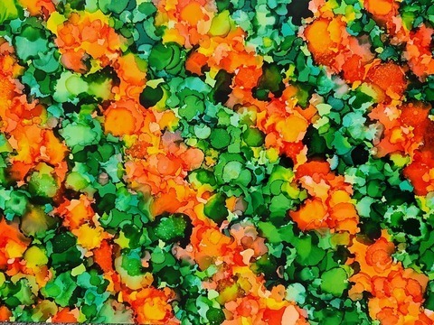 is a vibrant A2 alcohol ink artwork that overflows with life and growth, a celebration of colour and movement inspired by nature’s untamed beauty. Lush layers of green, fiery orange, gold, and warm red create the impression of a wild, blooming garden caught in a moment of pure abundance.