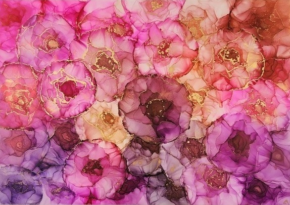 This original art piece showcases a stunning flow and fluidity achieved through airbrush techniques, resulting in delicate petals creating flowers that appear through the flow of the ink. Each flower is individually created, making many unique flowers. The gold edges around the flowers add a touch of luxurious elegance that reflects and shimmers in the light. This rare abstract floral art piece will bring a beautiful and relaxing atmosphere to any room. It’s perfect for those who have a love for flowers and appreciate the beauty and intricacy of this artwork. Don’t miss out on the opportunity to own this rare abstract floral art piece which will bring a beautiful and relaxing atmosphere to any room.