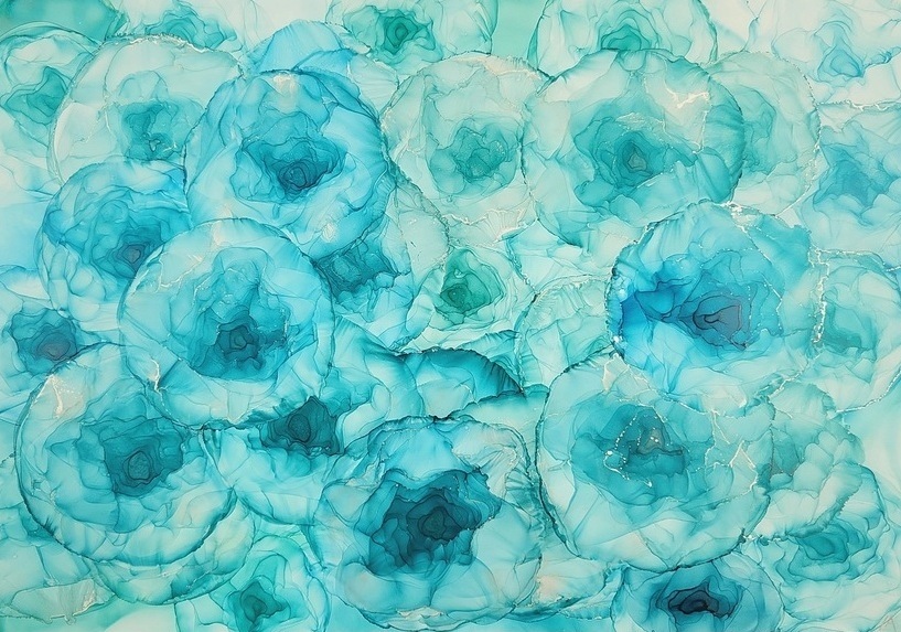 The larger size of my artwork whereby I can let the ink flow freely. Multi turquoise-teal coloured flowers with silver accents. Artwork measures 42 x 60 cm (A2) and comes framed in a white frame with Plexiglas measuring 62 x 86 cm (A1)