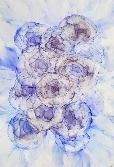 Indulge in the captivating beauty of this one-of-a-kind alcohol ink art painting. This stunning original art piece is created using a unique flow and airbrush technique that gives it a soft and fluid appearance. The painting features a gorgeous range of blues, with a delicate balance of rose gold flowing through to add a touch of shimmer and reflection.