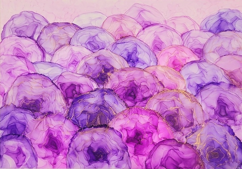 Soft purple and pinks creating a field of flowers with an accent of rose gold reflecting the light. Artwork measures 30 x 42 cm A3 and comes framed in a white frame with Plexiglas measuring 44 x 62 cm A2