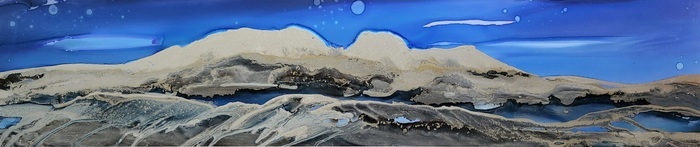 This work explores the quiet intensity of reflection, the kind that surfaces when surrounded by vast, unspoken landscapes. Inspired by the still power of nightfall and the grounding presence of earth, the painting was created using alcohol inks guided by air and instinct. Layers of ink and metallic accents drift and merge like fleeting thoughts, forming an imagined terrain where mind and memory wander freely. The deep blues and silvers evoke solitude, mystery, and the space where clarity can begin to form.