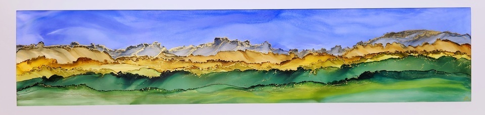 Each piece is an original creation, making it a one-of-a-kind work of art that will add a touch of sophistication to any space. The air wave and airbrush technique used in its creation result in a stunning abstract landscape panorama that is breathtakingly beautiful. With colours like blue, gold, ochre, and green meadows, this artwork is a feast for the eyes. The gold reflects the light, creating a mesmerizing effect that will leave you entranced. It's a work of art that will undoubtedly be the centre of attention in any room. So, whether you're a seasoned art collector or just looking to add a touch of unique beauty to your home, my alcohol ink art painting is a must-have. Don't miss out on the opportunity to own this stunning piece. Thank you for taking the time to look at my art.