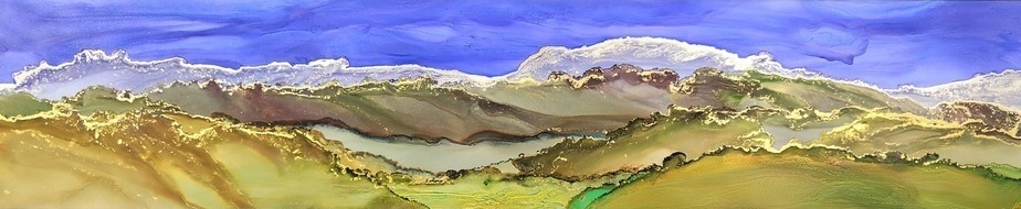 Landscape in vibrant ink colours from mustard/ ochre to green and anything in between. Silver snowcapped mountains with gold accent on the ridges of each layer.