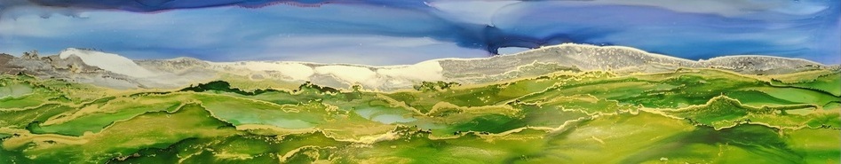 Landscape in vibrant ink colours from mustard/ ochre to green and anything in between. Silver snowcapped mountains / clouds with gold accent on the ridges of each layer.