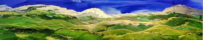 Landscape in vibrant ink colours from mustard/ ochre to green and anything in between. Silver snowcapped mountains / clouds with gold accent on the ridges of each layer.