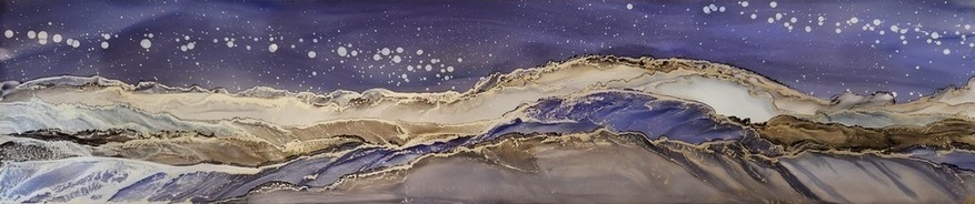 Introducing a one-of-a-kind original art piece that will take your breath away! This stunning alcohol ink art painting showcases a beautiful and unique abstract landscape in shades of blue and grey with hints of silver that reflect shimmers of light like a starry night sky. The fluid and flowy airbrush technique used to create this masterpiece provides a mesmerizing effect that transports you to a peaceful dusk scene. This art piece is truly a work of art. Don't miss the chance to own this beautiful and unique painting that is sure to impress your guests and leave a lasting impression on anyone who lays eyes on it.