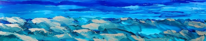 This stunning original artwork features a beautiful seascape with a panoramic view of ocean waves in teal and turquoise colours with silver accents that reflects and shimmers in the light. The liquid ink controlled with air wave and airbrush technique used to create it give the piece a sense of movement. This one-of-a-kind abstract piece is truly unique and sure to be a conversation starter. Bring a little piece of the ocean waves into your home with this beautiful and captivating artwork.