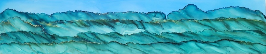 This stunning original artwork features a beautiful seascape with a panoramic view of ocean waves in teal and turquoise colours with golden accents that reflects and shimmers in the light. The liquid ink controlled with air wave and airbrush technique used to create it give the piece a sense of movement. This one-of-a-kind abstract piece is truly unique and sure to be a conversation starter. Bring a little piece of the ocean waves into your home with this beautiful and captivating artwork.