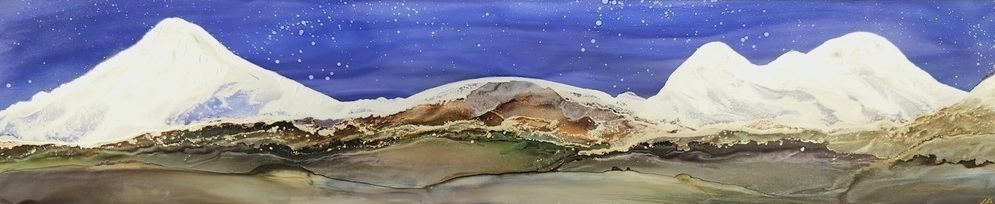 Snow capped mountains landscape panorama with rusty and olive coloured sloping hills with gold accent on the ridges of each layer. Original painting.