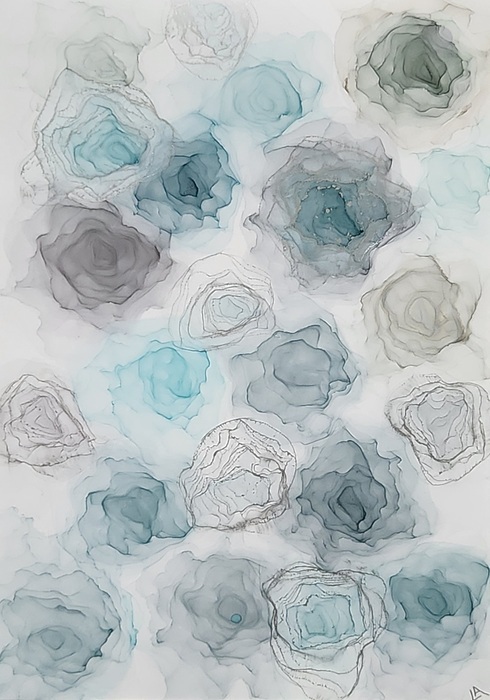 Soft grey - duck egg - teal flowers with silver accents. Artwork measures 30 x 42 cm (A3) and comes framed in a white or black frame with Plexiglas measuring 44 x 62 cm (A2)
