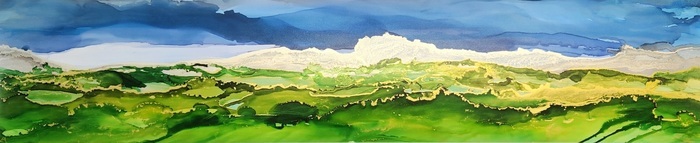 Immerse yourself in the lush beauty of nature with "Spring has Sprung," an original panorama alcohol ink painting by Lucie Anderson. This captivating piece brings to life the serene and vibrant essence of rolling hills under a vast, dynamic sky. The rich greens of the landscape blend seamlessly with the golden accents, while the blue and silver hues of the sky create a striking contrast, evoking a sense of calm and wonder.
