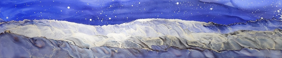 Introducing a one-of-a-kind original art piece that will take your breath away! This stunning alcohol ink art painting showcases a beautiful and unique abstract landscape in shades of blue and grey with hints of silver that reflect shimmers of light like a starry night sky. The fluid and flowy airbrush technique used to create this masterpiece provides a mesmerizing effect that transports you to a peaceful dusk scene. This art piece is truly a work of art. Don't miss the chance to own this beautiful and unique painting that is sure to impress your guests and leave a lasting impression on anyone who lays eyes on it.