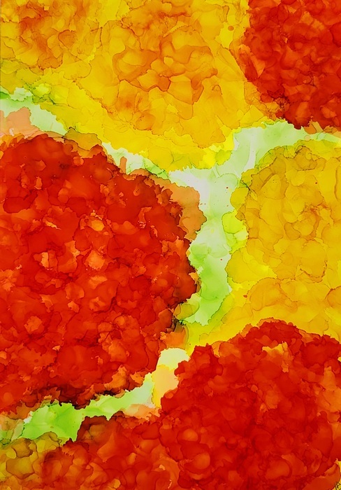 This alcohol ink art painting that will surely add a pop of colour and vibrancy to any space! Created using a unique flow and airbrush technique, this original art piece features a stunning range of warm and vibrant colours that are sure to catch your eye. Vibrant orange and yellow flowers with lime green foliage. This one-of-a-kind art can be hung in different directions to truly showcase its beauty. Grab your chance to own this stunning alcohol ink art painting and add a touch of creativity and colour to your space.