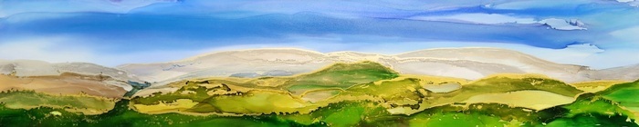 Through fluid alcohol ink and translucent layering, the terrain unfolds in gradients of green, ochre and gold, suggesting both movement and stillness.