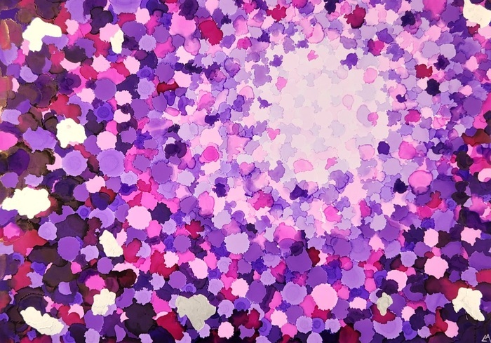 Funky, vibrant and fun but also classy. This artwork expresses such a vibrancy, warmth and depth. Splashes of pink, lilac, purple and silver. Artwork measures 42 x 60 cm (A2) and comes framed in a white frame with Plexiglas measuring 62 x 86 cm (A1)