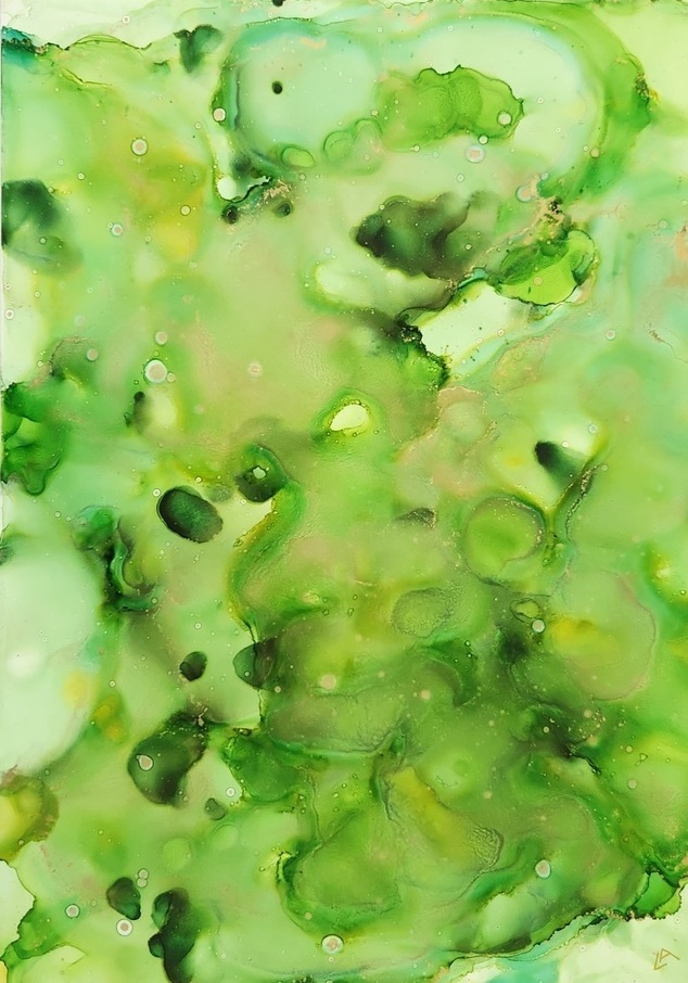 Gorgeous flow of vibrant shades of green and gold. Artwork measures 30 x 42 cm (A3) and comes framed in a white or black frame with Plexiglas measuring 44 x 62 cm (A2)