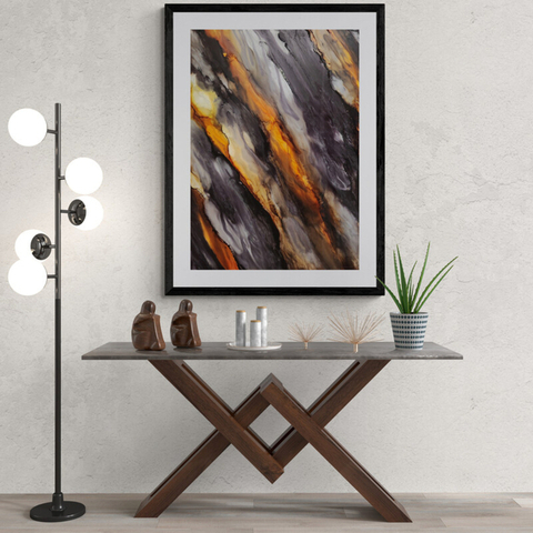 Dormant with Vigour captures the electric tension that lives beneath the earth’s surface — the quiet before eruption, the hidden pulse within stillness. Deep charcoal and ash-like tones create a sense of cooled volcanic rock, while fiery streaks of orange and gold cut through the surface with raw intensity.