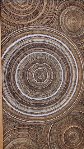 “Echoes of Time” is a contemplative, layered work constructed entirely from recycled corrugated cardboard. Each concentric circle was cut, shaped, and placed by hand — a meditative process that took many patient hours. This artwork speaks of rhythm and repetition, the way time expands and folds in on itself. The natural texture of the cardboard evokes tree rings, ripples in water, or the sedimentary build-up of the earth’s history — all silent records of memory and transformation.