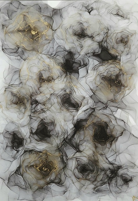 Soft grey - black flowers with golden accents. Artwork measures 30 x 42 cm (A3) and comes framed in a white or black frame with Plexiglas measuring 44 x 62 cm (A2)