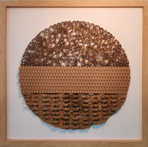 Layers of the Land is a hand-crafted circular wall sculpture made from reclaimed corrugated cardboard. Inspired by the textures and stories of the whenua (land), this work explores natural form through three distinct sections: an intricate lace-like upper layer, a central pattern suggesting human presence, and a more grounded, earthy base.