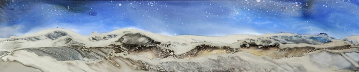 This stunning original artwork features a beautiful seascape with a panoramic view of ocean waves in earthy colours with silver accents that reflects and shimmers in the light. The liquid ink controlled with air wave and airbrush technique used to create it give the piece a sense of movement. This one-of-a-kind abstract piece is truly unique and sure to be a conversation starter. Bring a little piece of the ocean waves into your home with this beautiful and captivating artwork.