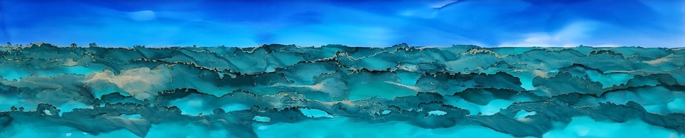 This stunning original artwork features a beautiful seascape with a panoramic view of ocean waves in teal and turquoise colours with silver accents that reflects and shimmers in the light. The liquid ink controlled with air wave and airbrush technique used to create it give the piece a sense of movement. This one-of-a-kind abstract piece is truly unique and sure to be a conversation starter. Bring a little piece of the ocean waves into your home with this beautiful and captivating artwork.