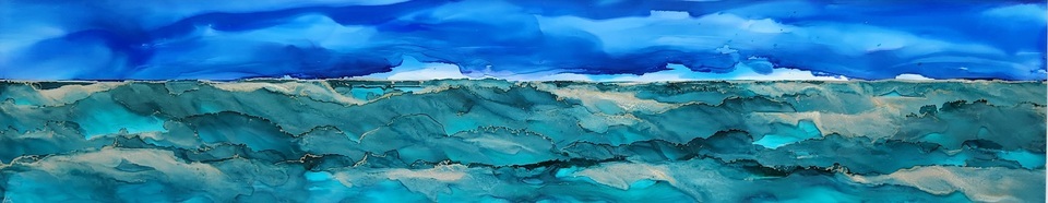 This stunning original artwork features a beautiful seascape with a panoramic view of ocean waves in teal and turquoise colours with silver accents that reflects and shimmers in the light. The liquid ink controlled with air wave and airbrush technique used to create it give the piece a sense of movement. This one-of-a-kind abstract piece is truly unique and sure to be a conversation starter. Bring a little piece of the ocean waves into your home with this beautiful and captivating artwork.