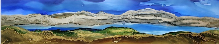 Immerse yourself in the breathtaking beauty of "The Mystique of Lake Taupo" an original panorama alcohol ink painting by Lucie Anderson. This stunning piece captures the tranquil majesty of Lake Taupo, New Zealand's largest lake, known for its blue waters and picturesque surroundings.